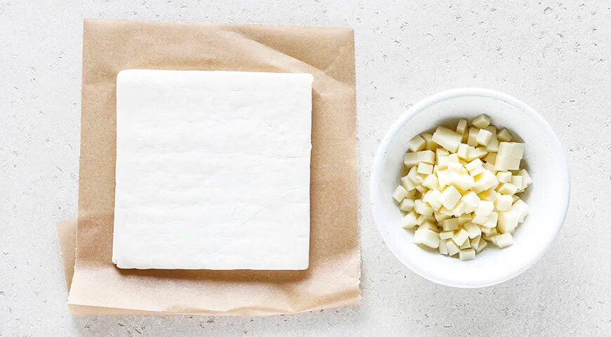 Для приготовления аппетитных сырных слоек понадобится всего несколько ингредиентов, и готовить их невероятно просто. Разморозьте готовое слоеное тесто, если оно было заморожено, чтобы потом работать с ним без труда. Сыр сулугуни нарежьте кубиками небольшого размера или натрите на крупной терке. Также не забудьте подготовить противень, застелив его пергаментом.