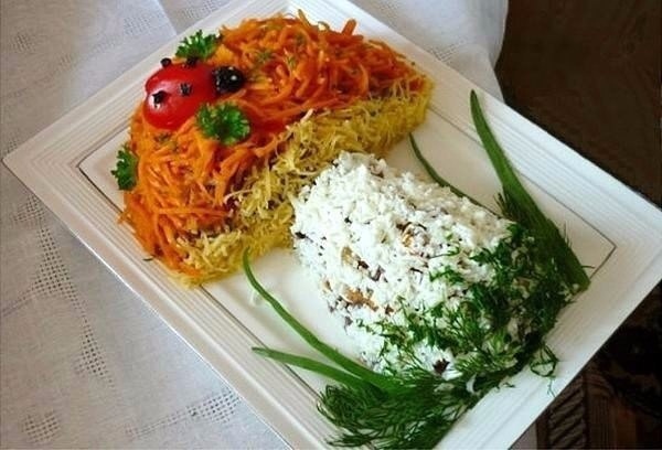 Формирование салата: На блюдо выложить все ингредиенты, придавая форму грибка. Ножку салата оформить тертым белком яйца, посыпанным укропом. Для шляпки использовать тертую варёную морковь, а основание украсить тертым сыром.