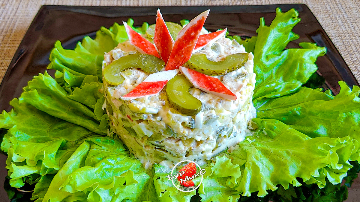 7. На тарелку выложите листья зелёного салата. Из салатной массы сформируйте горку через специальное кольцо, а сверху украсьте крабами и огурцами.