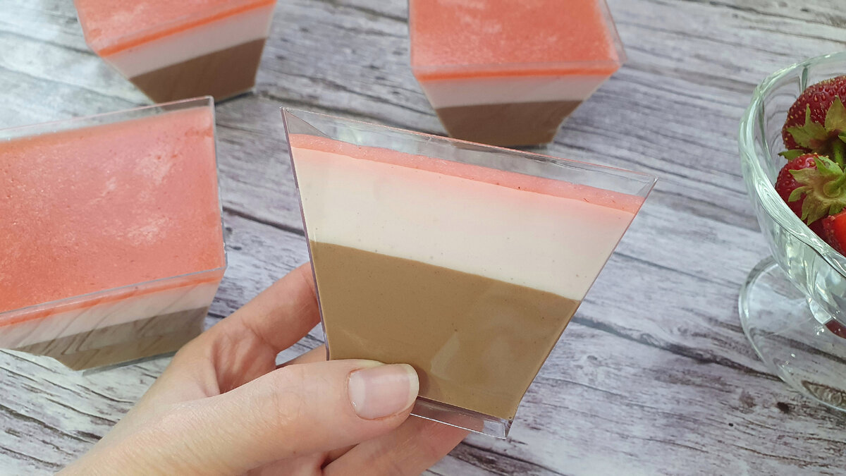 Теперь приготовим клубничное желе, аналогично предыдущим этапам. После приготовления, разлейте желе по стаканчикам и дайте застыть минимум 3 часа в холодильнике.