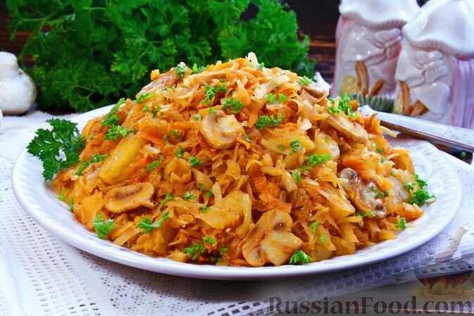 - Тушёная капуста с картошкой и грибами — Простое, но в то же время удивительное блюдо, готовящееся из доступных ингредиентов с насыщенным вкусом.