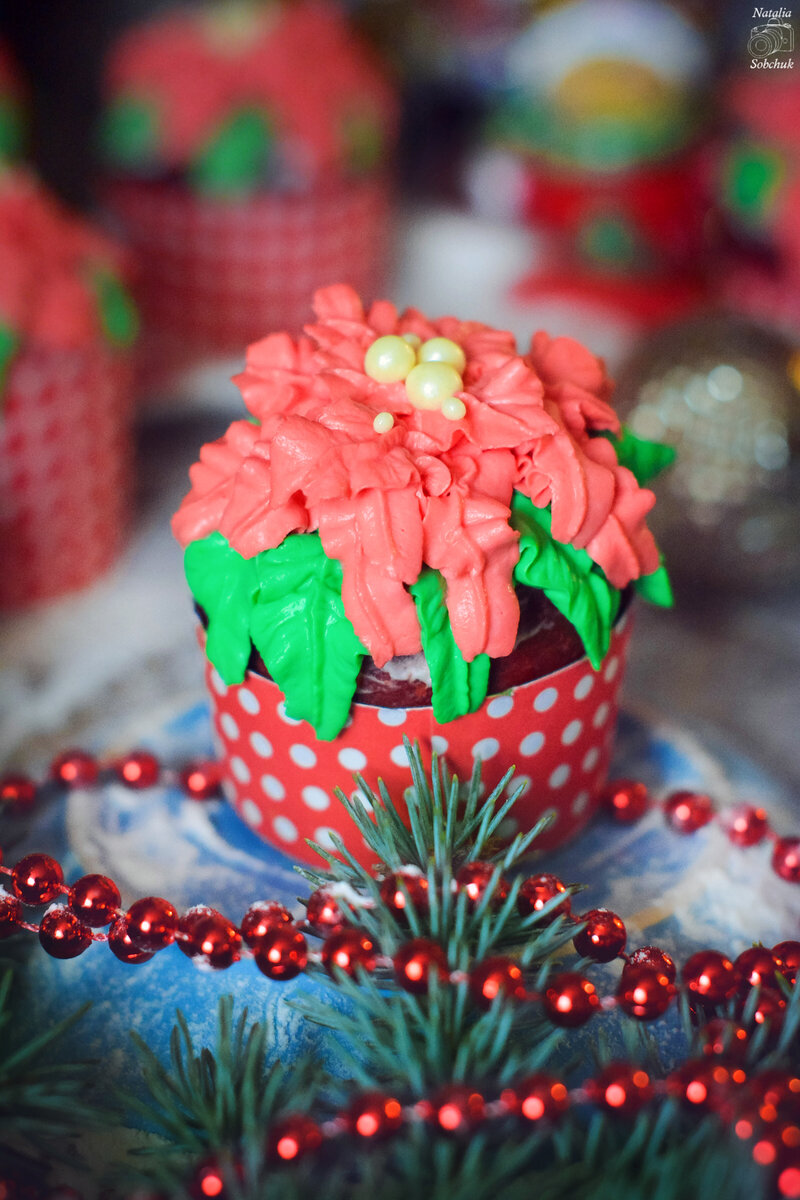 Эти капкейки «Красный бархат» или «Рождественская пуансетия» сияют в праздничной обстановке, удивляя не только глаз, но и вкус. Ароматные и воздушные, они создают настоящую атмосферу зимнего чудесного праздника. С начинкой из черничного джема и изысканным сливочным кремом, эти десерты заслуживают место на любом новогоднем столе.