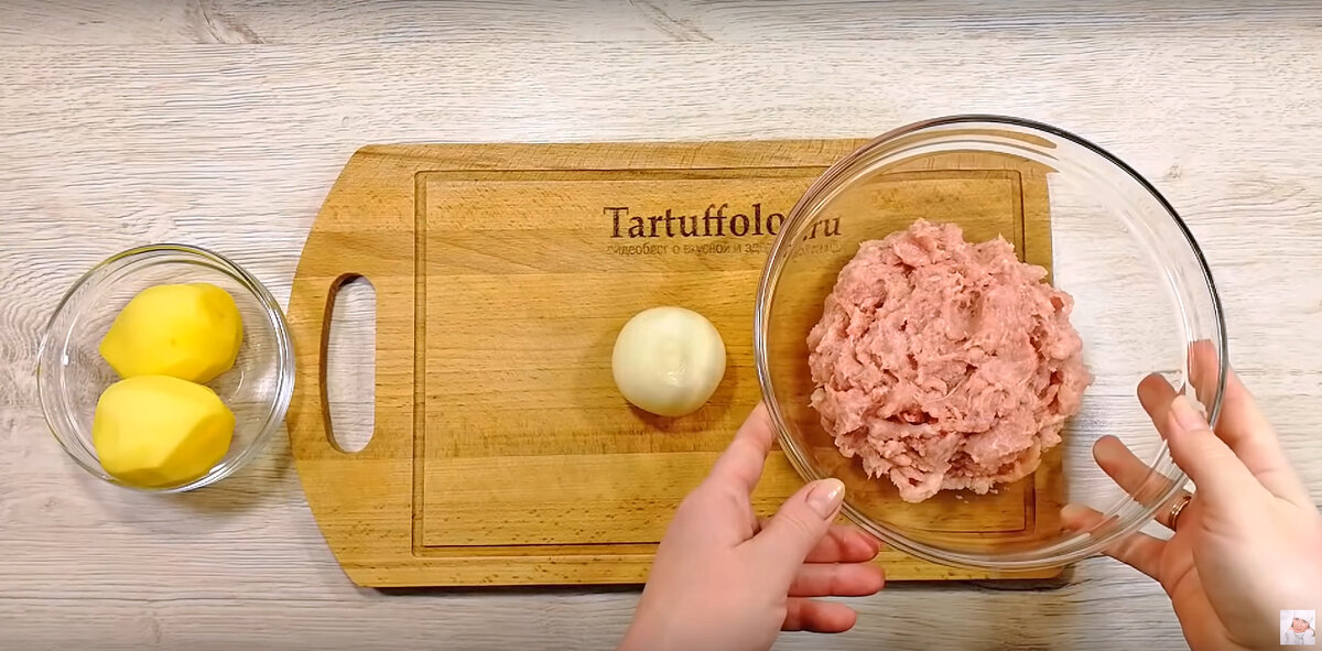 Для начала, из куриных бедер приготовить фарш. Затем одну небольшую луковицу мелко нарезать четвертинками и посолить. Чтобы сделать лук более мягким, его нужно аккуратно помять руками. После этого добавить лук в фарш.
