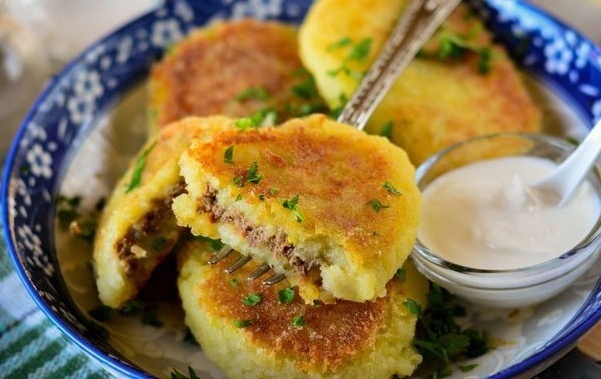 Когда печени остынут, её вместе с обжаренной морковью и луком пропускают через мясорубку — это станет начинкой для зраз. Из картофельной массы формируют овал, в центр которого кладут чайную ложку начинки, а затем аккуратно лепят зразы, придавая им округлую форму.