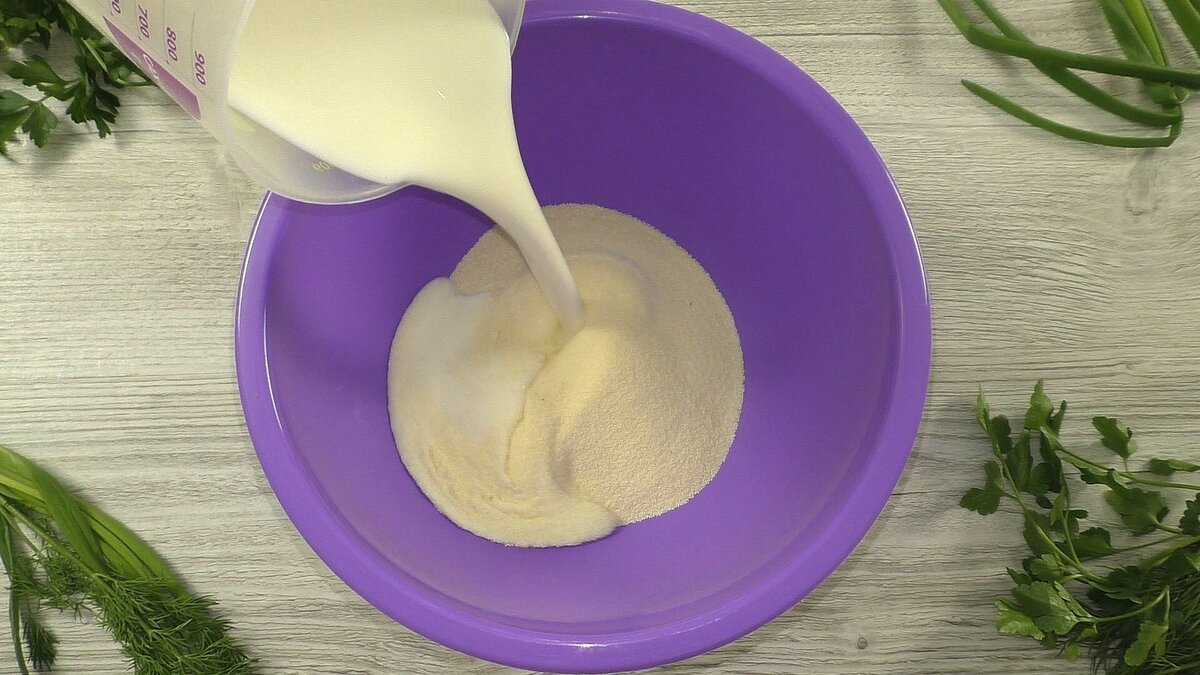 1. Первым делом соединить манную крупу с кефиром и тщательно перемешать. Оставить смесь на 15-20 минут для набухания крупы.