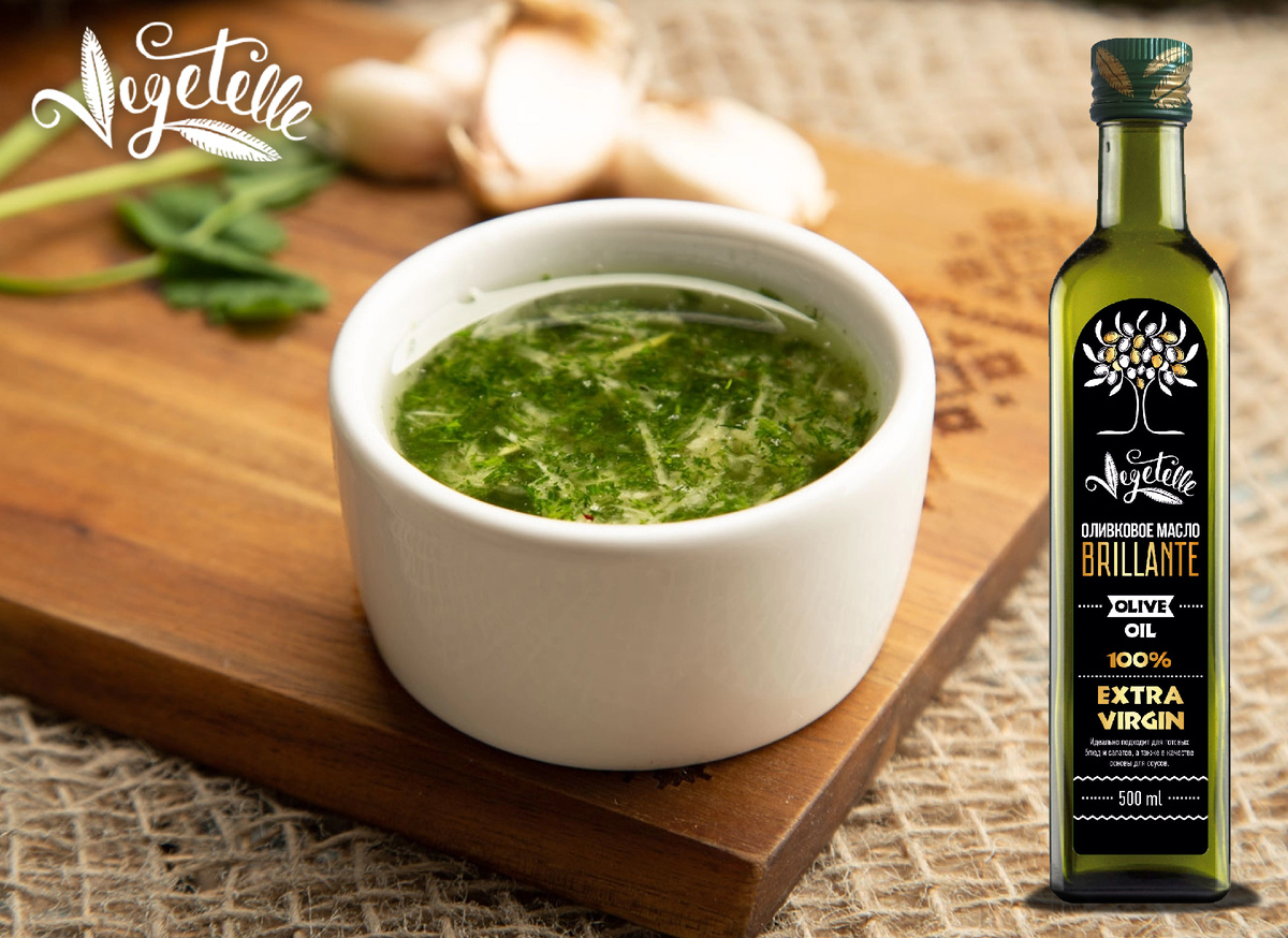 Далее вливается оливковое масло и черный молотый перец. Все тщательно перемешивается, после чего соус переливается в красивую соусницу, готов к подаче.