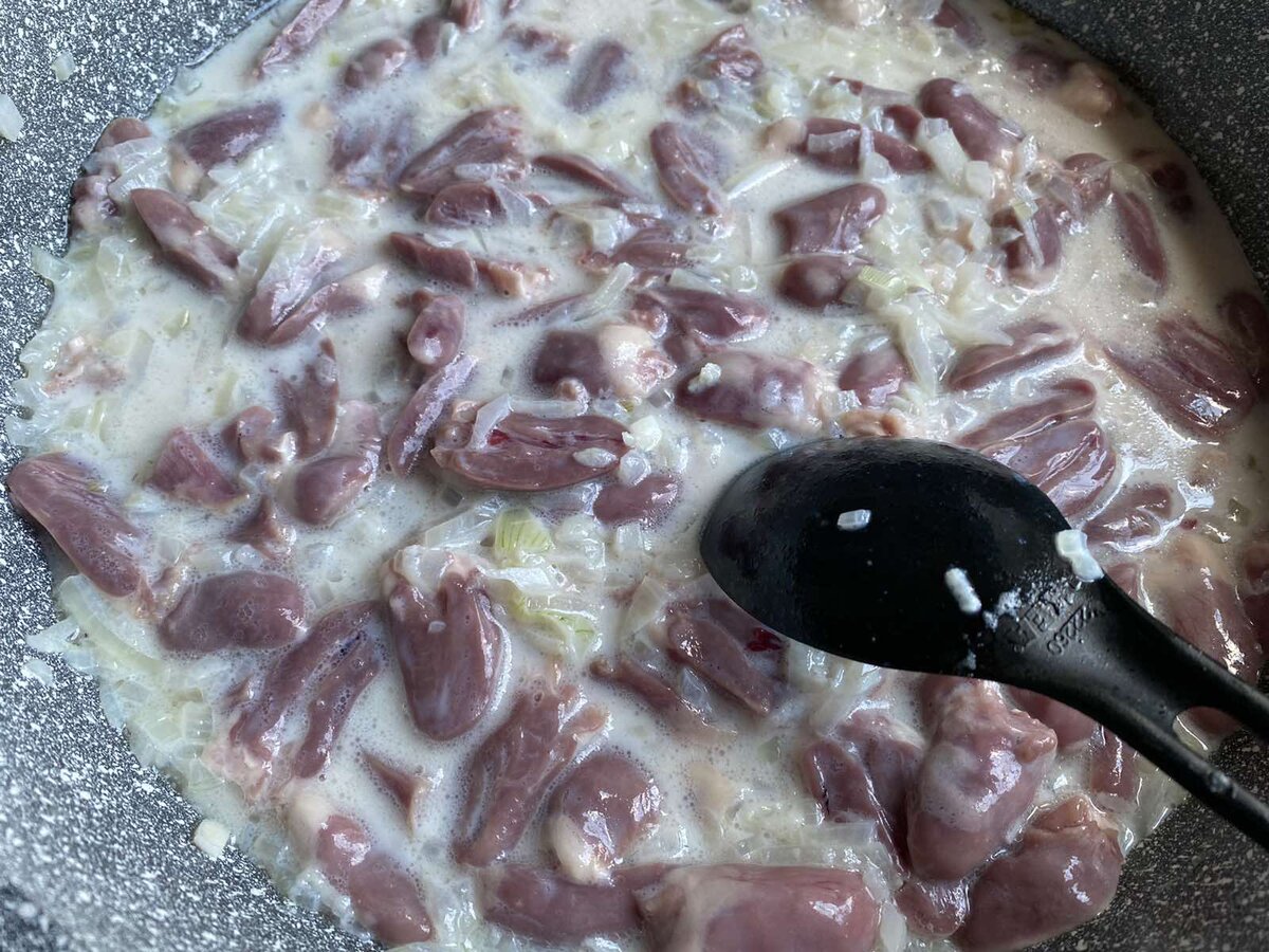 4. К луку добавьте сердечки вместе с молоком, перемешайте, убавьте огонь и тушите 15-20 минут.