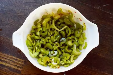 Представляем вашему вниманию вкуснейший пряный салат, который не только украсит ваш стол, но и удивит оригинальным сочетанием вкусов. Этот легкий и свежий салат можно приготовить заранее и хранить в герметичном контейнере. При этом он останется свежим в холодильнике до трёх дней. За это время сельдерей впитает все прелести соуса и сделает его более насыщенным. На выходе получается превосходная приправа, которая отлично дополнит любые мясные блюда.