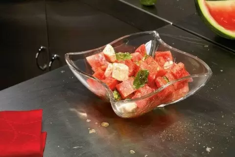 1. Начать стоит с арбуза: необходимо удалить косточки и нарезать его на крупные кубики. Форму кусочков можно не стесняться, ведь их округлость добавляет характер блюда.