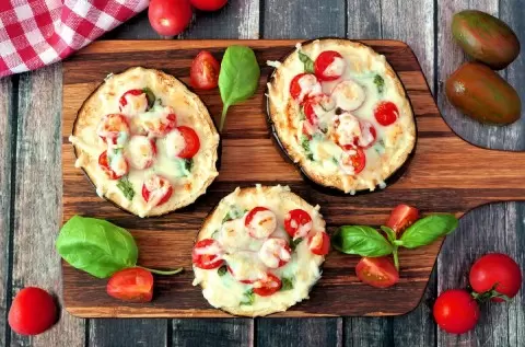 Блюдо можно дополнительно украсить свежими помидорами или использовать в качестве начинки колбасу или вяленое мясо для большей сытности. Чтобы подать баклажаны на праздничный стол, можно нарезать их веером и начинить, запекая до готовности. Приятного аппетита!