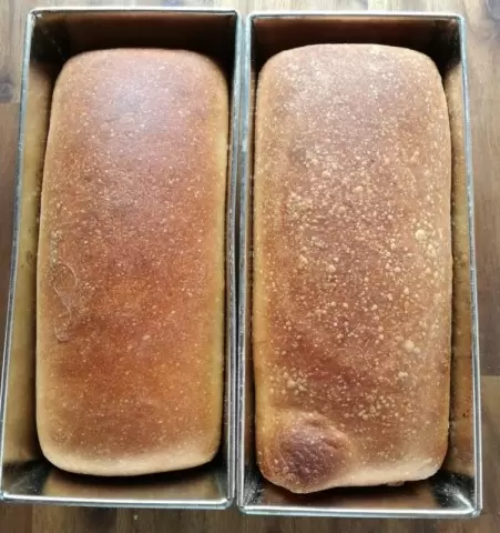 3. Накройте тесто пленкой и дайте ему подойти в тепле примерно 40 минут. Затем разделите его на две равные части и сформируйте буханки, аккуратно подворачивая края и укладывая тесто в формы.