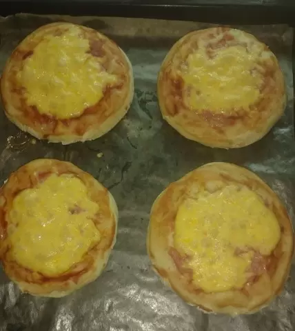 Позвольте заготовкам немного подняться — это займет около двадцати минут. Тем временем подготовьте начинку: натрите колбасу и сыр. Когда пиццы поднимутся, смажьте их сладким кетчупом, добавьте колбасу и посыпьте сыром. За пять минут до окончания выпечки можно дополнительно смазать края пиццы желтком для золотистой корочки.