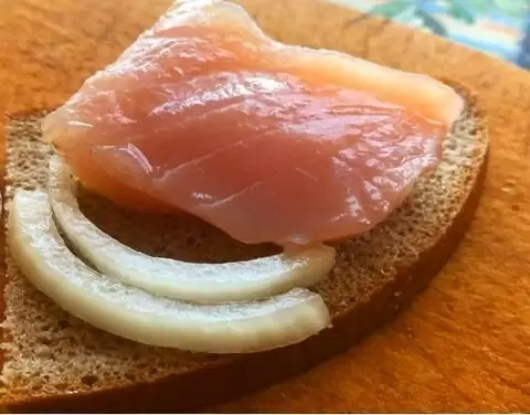 После того как прошло время, откидываем рыбу на дуршлаг и промываем холодной проточной водой, чтобы удалить излишки соли. Далее необходимо вернуть рыбу с луком обратно в посуду и залить 6%-ным уксусом так, чтобы рыба была полностью им покрыта. Оставляем на 2 часа, в течение которых рыба поменяет цвет и приобретет «вареную» текстуру.