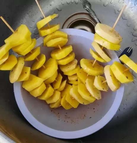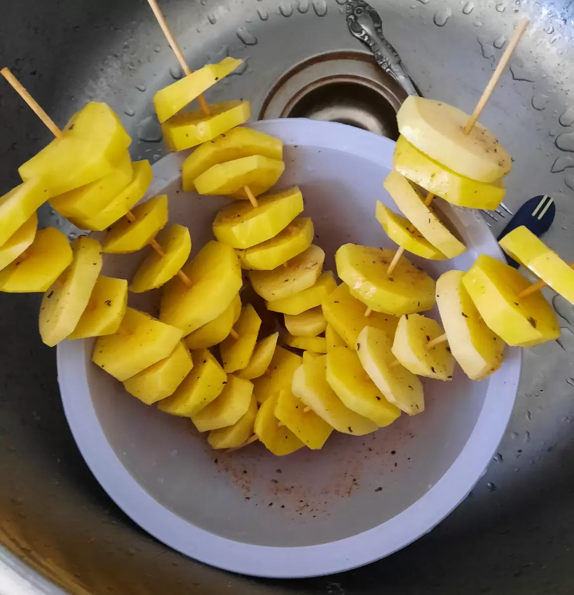 Подготовьте прямоугольную форму, в которую можно будет уложить шпажки так, чтобы они держались на бортиках. Это создаст эффект «чипсов», даря блюду оригинальность и стиль.