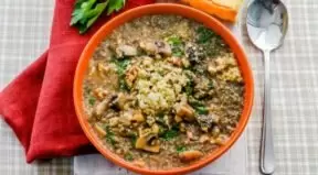 Шаг 6: Выложите горячую пшенную крупу в тарелки, залейте грибным супом, посыпьте грецкими орехами и мелко нарезанной петрушкой. Подавайте с поджаренным багетом.