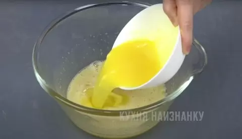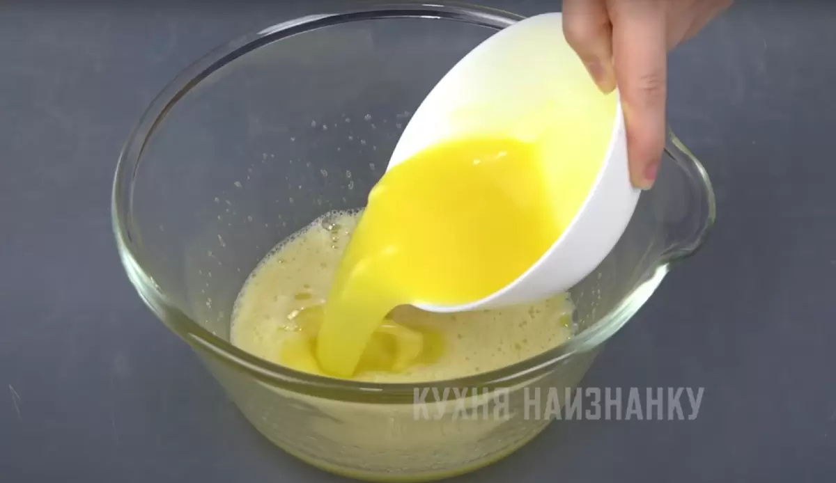 В глубокой миске яйца нужно тщательно взбить с сахаром и ванилином. Для этого подойдет как венчик, так и обычная вилка. По желанию можно добавить щепотку соли для улучшения вкуса. Затем следует влить растопленное сливочное масло и перемешать до однородности.