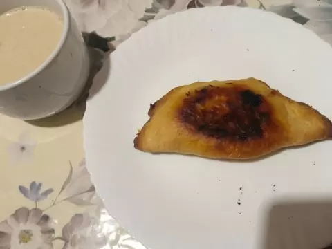 - Завтрак: чебурек весом 140 граммов, сливки 10% — 100 граммов, и 10 граммов сахара в кофе.