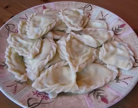 В отдельной миске творог разминается, добавляется зелень укропа, обжаренный лук и соль. Все тщательно перемешивается, после чего добавляются яйца. Получившаяся масса достаточно жидкая, поэтому лепка вареников требует особого подхода.