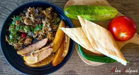 - Классический мегрельский рецепт: Говяжьи потроха (рубец, сердце, легкие, печень) с добавлением аджики, уцхо-сунели и граната.