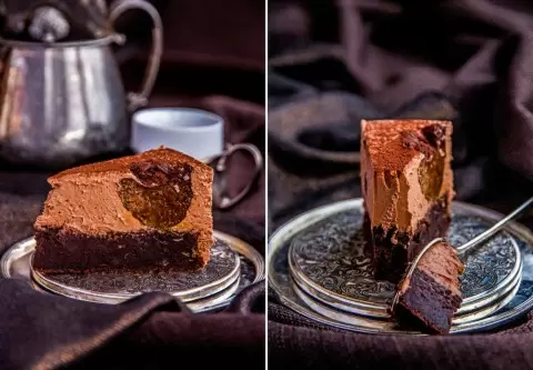 Шоколад плавится на водяной бане, после чего вводятся взбитые сливки и мелко порубленный чернослив. Получившуюся массу выливают в форму с охлажденным бисквитом, а сверху помещают пару целых черносливов для украшения.