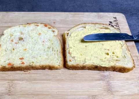 Приступаем к процессу: смажьте кусочки тостового хлеба горчичным соусом. Затем аккуратно разместите отварные креветки. Креветки можно сменить другими начинками, такими как ветчина или колбаса, в зависимости от предпочтений.