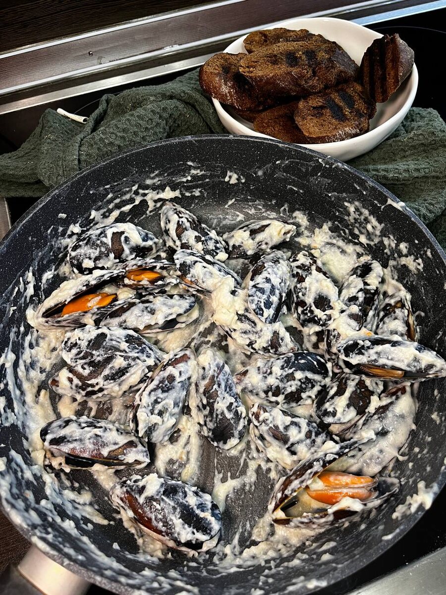 Ингредиенты собрались быстро: мидии 450 г, сметана 150–200 г, голубой сыр 50 г и чайная ложка муки для мягкого загустения. На раскаленную сковороду отправьте сметану, затем добавьте сыр и муку, помешивайте, пока сыр не расплавится. Введите мидии и ещё раз перемешайте. Соус станет нежным и густым, а мидии останутся сочными внутри.