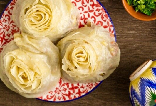 Перевод слова "гуль-хунон" означает "рулет-цветок", и это название оправдывает себя. Казахстанские кулинары готовят эти симпатичные пельмени из тонкого теста с разными начинками: мясом, тыквой, картофелем, морковью, шпинатом и даже молодой капустой. Обычно их готовят на пару — как манты — или в различных овощных соусах, что делает блюдо особенно полезным. На этот раз предлагается рецепт с мясом и томатным соусом, дополненный нежным сметанным соусом.