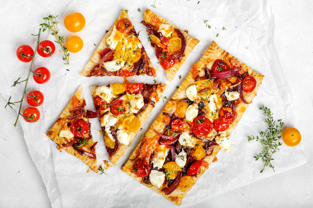 Помидоры черри разрезать пополам. Подготовить противень, застелив его пергаментом, и выложить тесто. На него добавить луковый мармелад, черри и кусочки творожного сыра, а сверху обильно посыпать тертой моцареллой. Украсить края, прижимая тесто вилкой для создания оригинального рисунка.