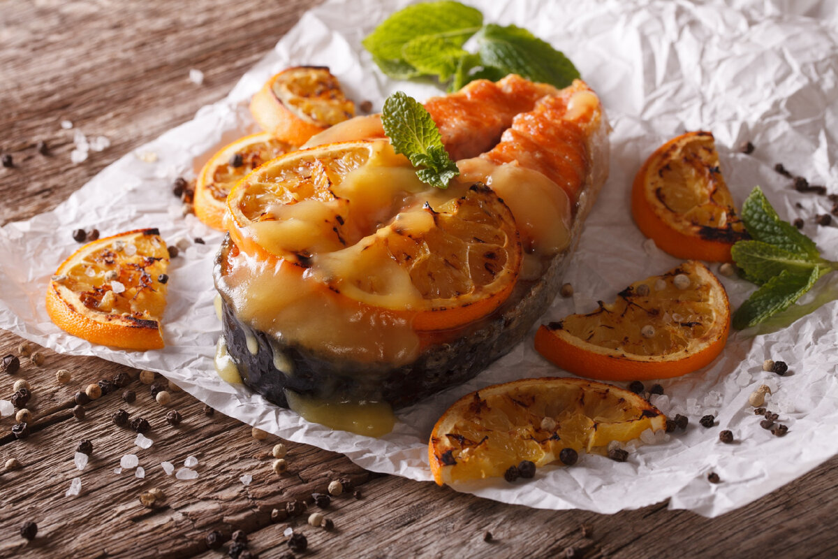 Запечённый лосось станет настоящим украшением стола: нежная рыба в сочетании с цитрусами и терияки порадует даже самых взыскательных гурманов. Как гарнир отлично подойдут картофельное пюре, тыквенное или рис.