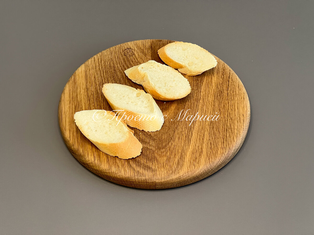 Первым делом нарежьте багет и поставьте его в духовку на пять минут. Если у вас есть режим конвекции или гриля, это будет только плюсом.