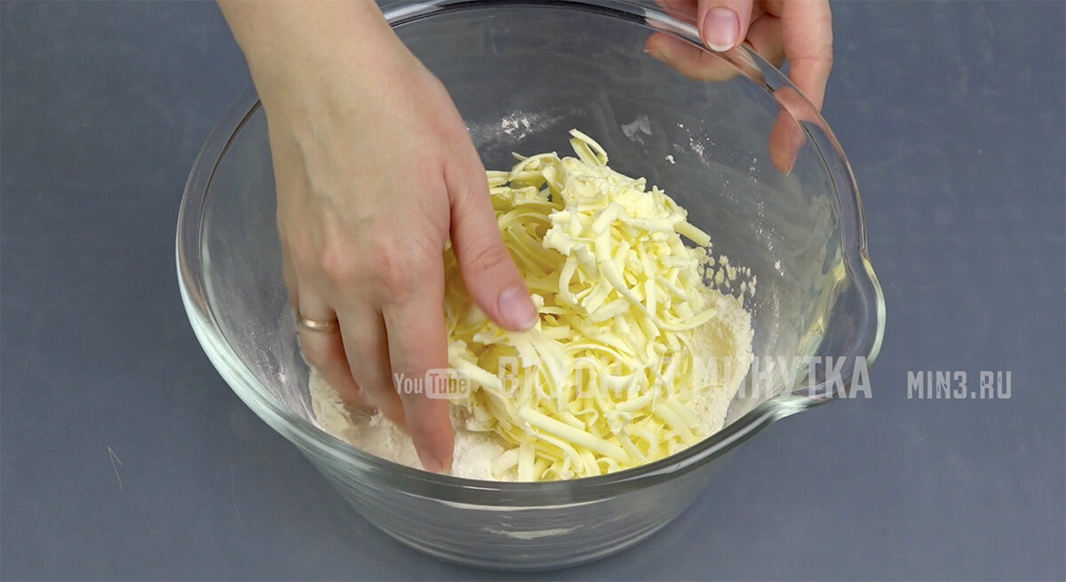 Предварительно замороженное сливочное масло натрите на терке и добавьте к муке, перетирая все до состояния крошки.