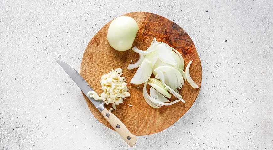 На разогретую сковороду добавляется сливочное масло, после чего выкладывается лук. Необходимо обжаривать его на среднем огне 4-5 минут, пока лук не станет прозрачным и не приобретет легкий золотистый оттенок. Затем в сковороду добавляется нарезанный чеснок и прогревается еще в течение 30 секунд.