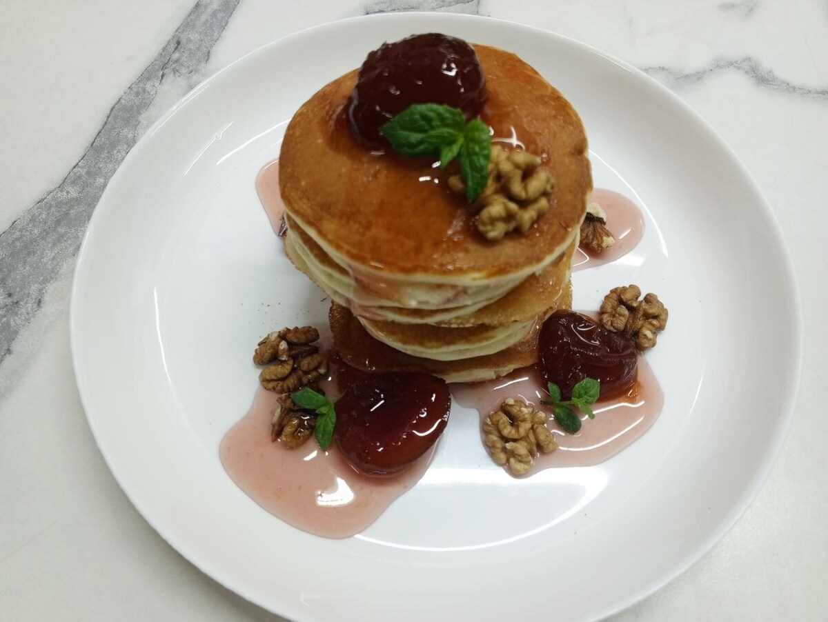 Панкейки подаются с сиропом, медом, вареньем и могут быть украшены орехами или ягодами для особого акцента.
