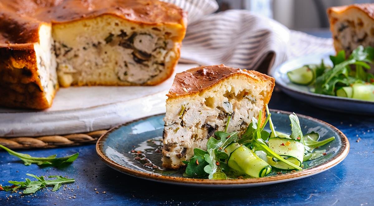 Этот сытный пирог никого не оставит равнодушным. Для начинки можно использовать разные виды грибов, но наилучший результат получится с ароматными маслятами или подосиновиками. Не менее вкусно будет и с шампиньонами — свежими, замороженными или консервированными. Что касается сыра, рекомендуется выбирать твердые сорта. Хотя в рецепте используется куриный фарш, его можно смело заменить индейкой.