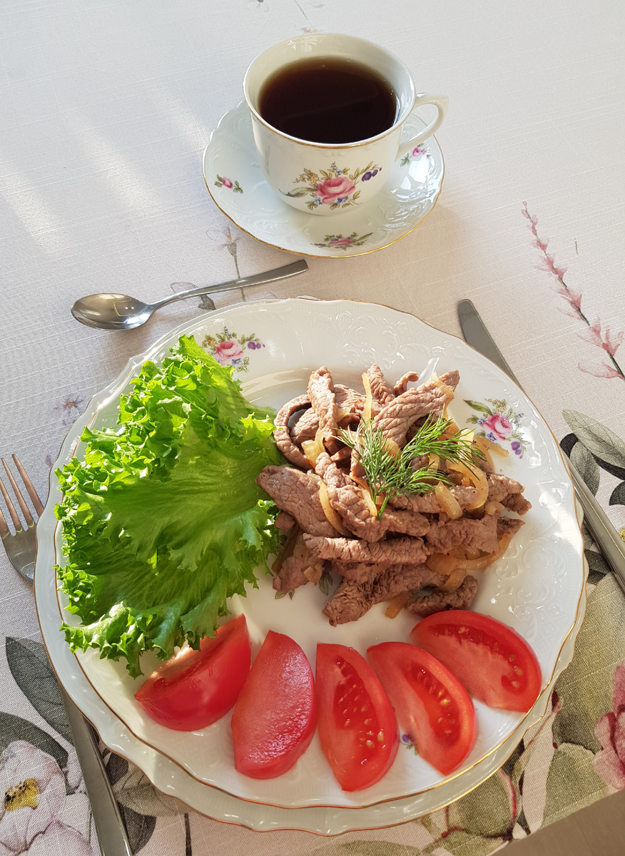 1. Подготовка ингредиентов: Лук нарезать четвертинками колец, а телятину — тонкими полосками поперек волокон. Обкатать мясо в соли и перце, полить растительным маслом и тщательно перемешать.
