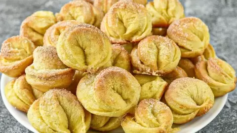 6. Насыпьте сахар на тарелку. Опустите одну сторону заготовки в сахар и придайте ей форму, например, сложив пополам и соединяя концы.