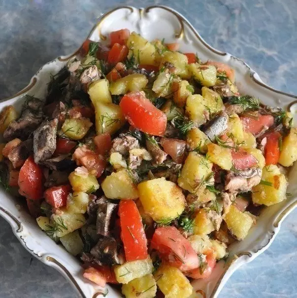 Первым делом картофель стоит отварить, затем охладить и нарезать кубиками, после чего обжарить до золотистой корочки. Помидоры также нарезаются, а шпроты аккуратно отделяются от масла и мелко измельчаются. Укроп третьим этапом нарезается мелко, чтобы добавить аромата и свежести.