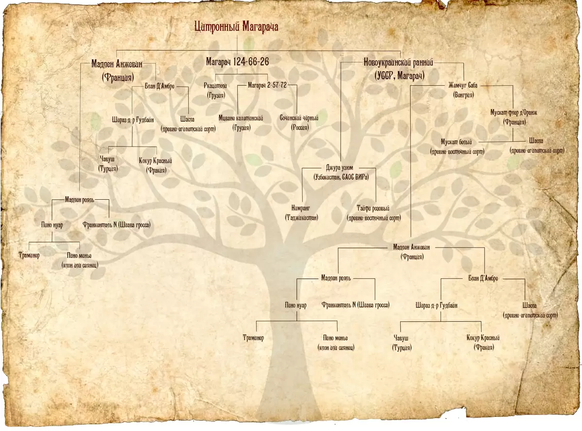 Генеалогическое древо Цитронного Магарача не без интереса: среди его предков можно найти старинные сорта из Египта и Древнего Востока, грузинские разновидности и даже ныне утерянные российские автохтоны, такие как «Сочинский чёрный». Аромат, присущий этому сорту, во многом обязан французскому Мускату флер д'Оранж, что делает его наследие поистине богатым.
