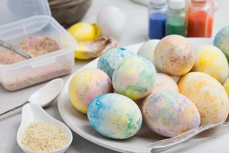 2. **Акварельный эффект:** В контейнер насыпаем рис и добавляем несколько капель красителей. Потрясите, чтобы рис окрасился, затем поместите туда яйцо и трясите его. На скорлупе появятся плавные восьмицветные узоры.