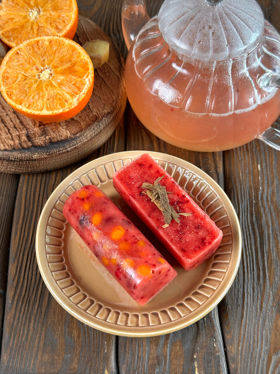 Представленный рецепт предлагает удобные замороженные кубики для чая с апельсином, имбирем, клюквой и облепихой. Просто достаньте один кубик из морозилки, залейте его кипятком, и через несколько минут порадуйте себя ароматным и полезным напитком.
