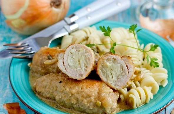 На каждый отбитый кусочек свинины выложить достаточно много лука и свернуть рулетик, предварительно обваляв в муке. Обжарить рулетики на раскалённом подсолнечном масле до золотистой корочки, избегая тушения.